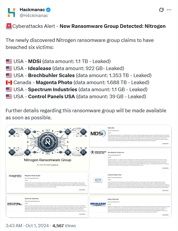 X post announcing the discovery of Nitrogen ransomware group, via Hackmanac
