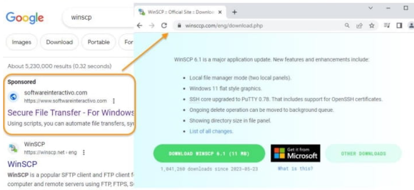 Malvertising / poisoned ads that lead victims to malicious or trojanized installers for legitimate applications like WinSCP and Advanced IP Scanner. |