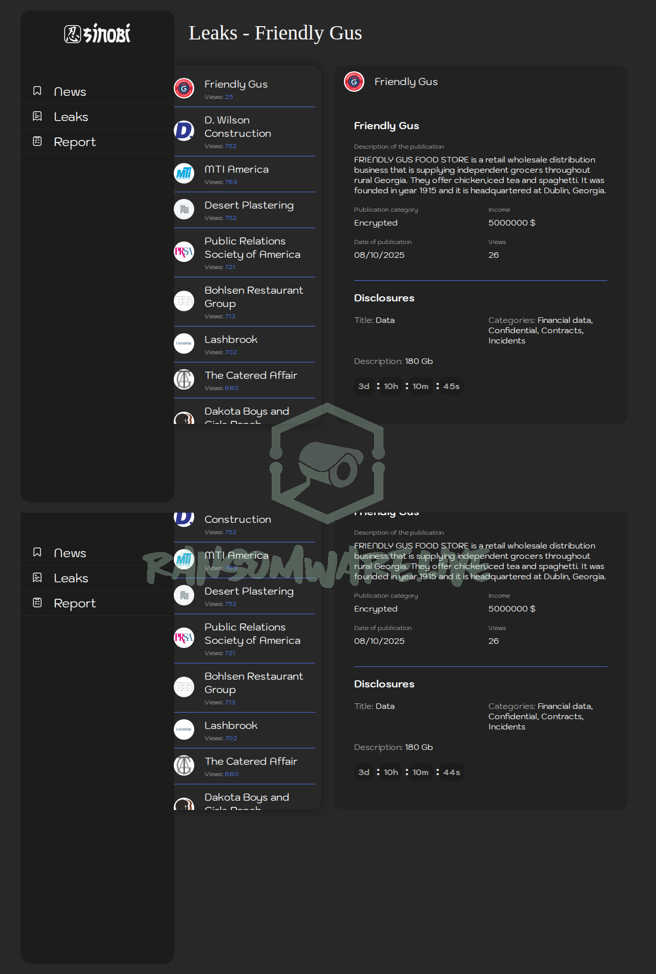 “Sinobi” – A simple, TOR-based leak site that lists victims, sample stolen data, and a countdown timer. The group operates separate leak and chat sites, and both have clear web mirrors. |