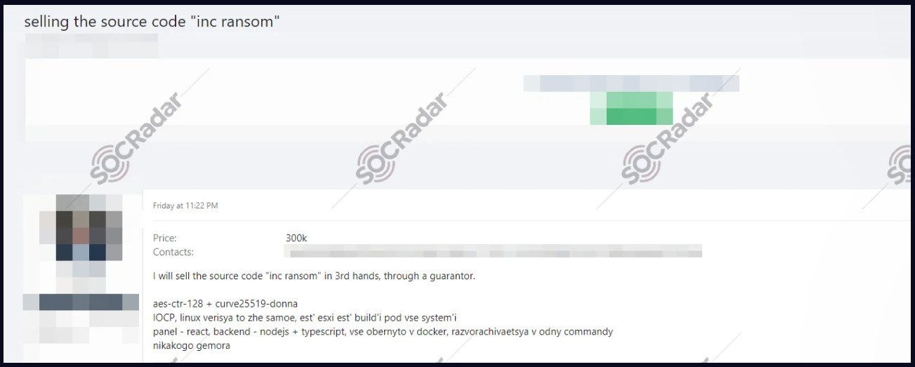 Forum post offering INC ransomware for sale, via SOCRadar
