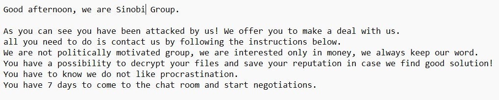 Start of Sinobi ransom note, via Ransomware.Live