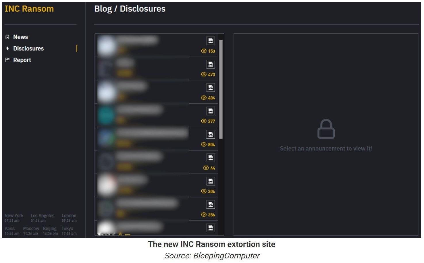 INC ransomware link site, via Bleeping Computer