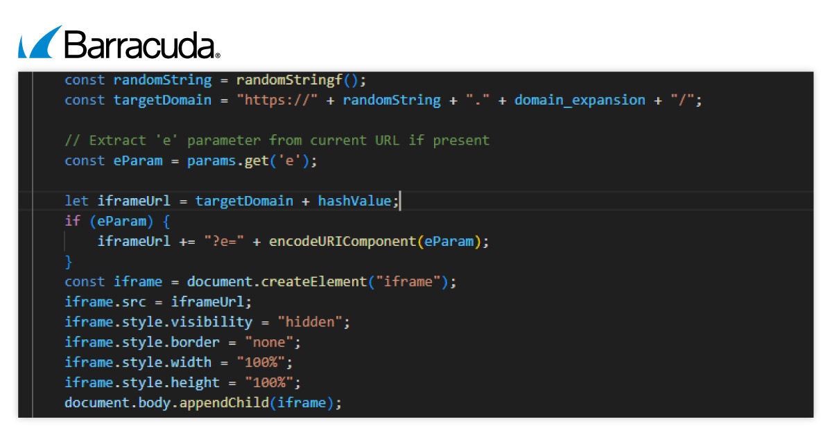 The outer, primary phishing page — the harmless-looking HTML file — that is shown to users does not include any typical phishing elements. Instead, it features some basic obfuscation to conceal its purpose and uses dynamic code to generate and manipulate subdomain names so that a new one is generated for each target.
