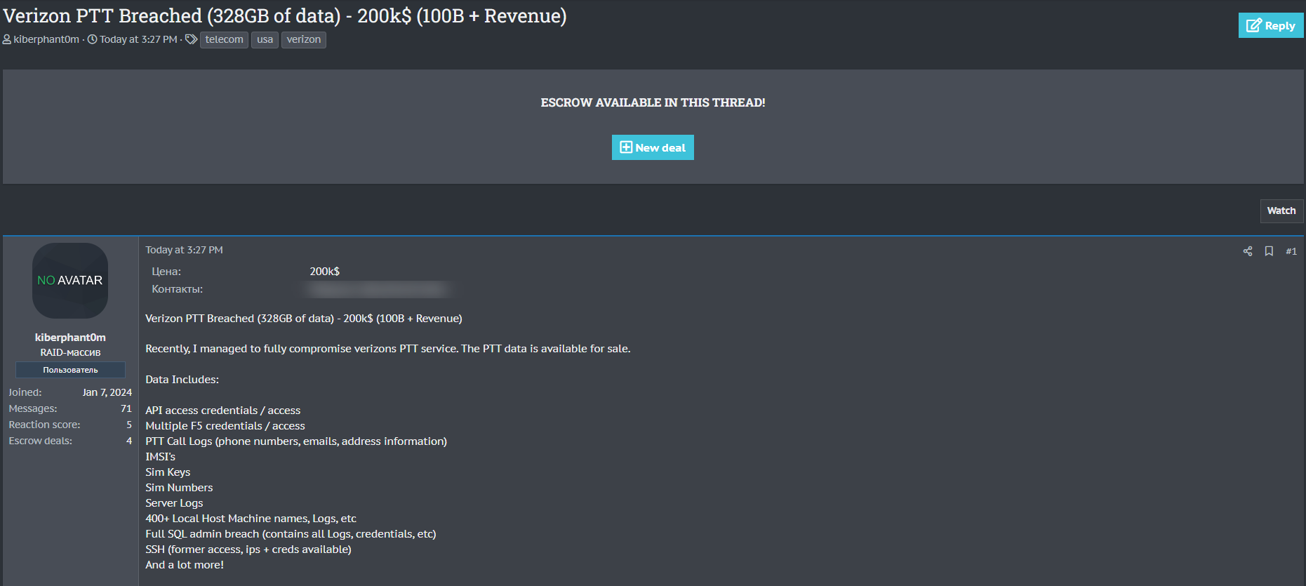 Forum post offering Verizon data for sale. Cameron John Wagenius operated online under the alias “kiberphant0m" and worked alongside co-conspirators to break into corporate networks and steal sensitive data. Full story and more images at Dark Web Informer.