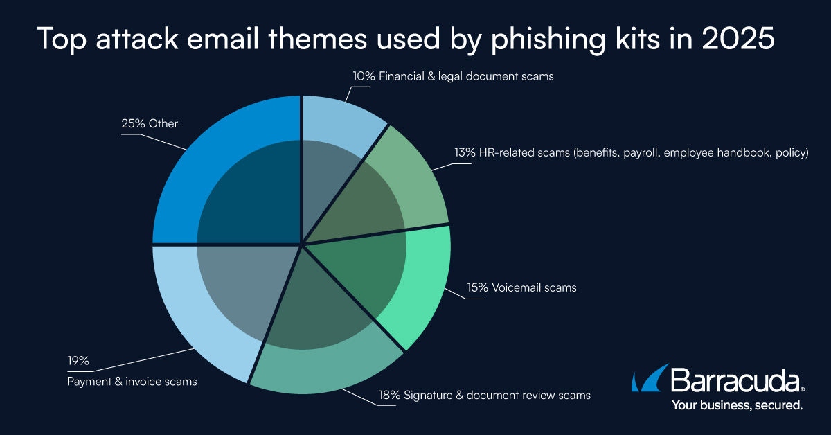 The most common phishing themes seen by Barracuda threat analysts during 2025 were worryingly familiar. They included fake payment, financial, legal, digital signature and HR-related messages — all designed to trick users into clicking on a link, scanning a QR code or opening an attachment and sharing personal information with attackers.